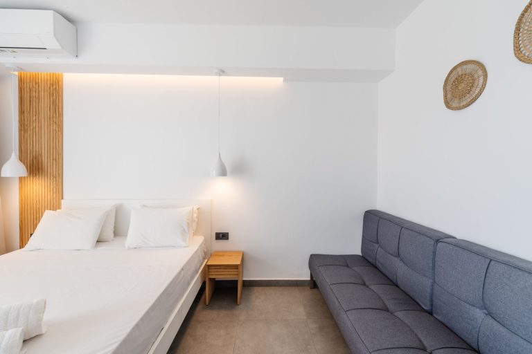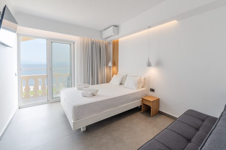 These spacious & cozy open plan Deluxe Suites feature a large double bed and a sofa bed. Elegantly and minimalist decorated offering a spectacular sea view over Pontikonisi island.