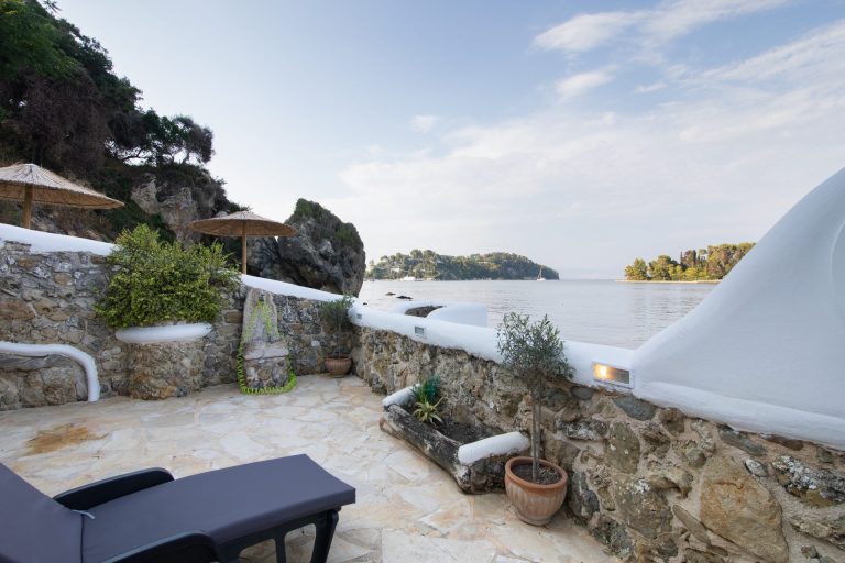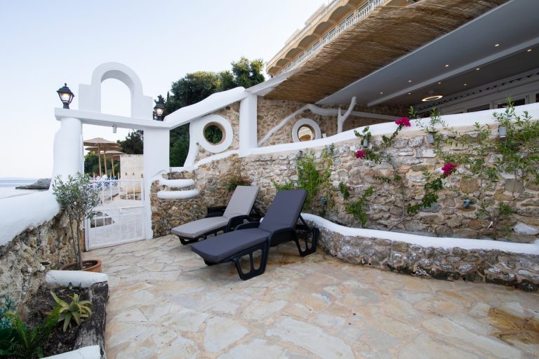 Αυτό το άνετο και κομψό μπανγκαλόου παρέχει πρόσβαση στα κρυστάλλινα νερά του Ιονίου. Από τη χαλαρωτική βεράντα, όπου υπάρχει μια μίνι πισίνα, μπορείτε να απολαύσετε την υπέροχη θέα στο Ποντικονήσι.